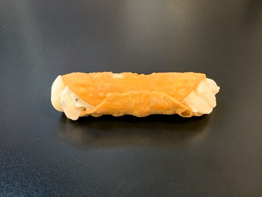 Creamy ricotta with chocolate chips mixed in, filled inside a cannoli tube.