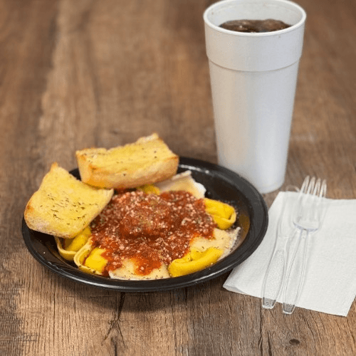 10 freshly made tortellini noodles that are stuffed with a ricotta cheese blend and topped with our Original marinara recipe and one of our Original hand made meatballs with a side of garlic bread