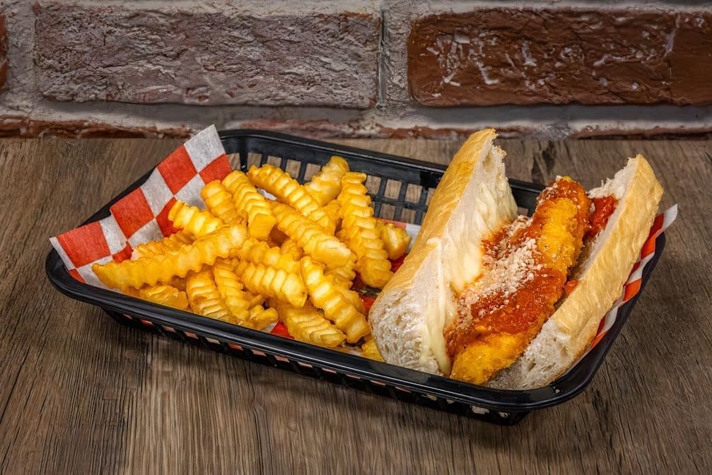 Two tender breaded chicken tenders, smothered with red sauce and melted cheese on a 6" toasted Turano french roll