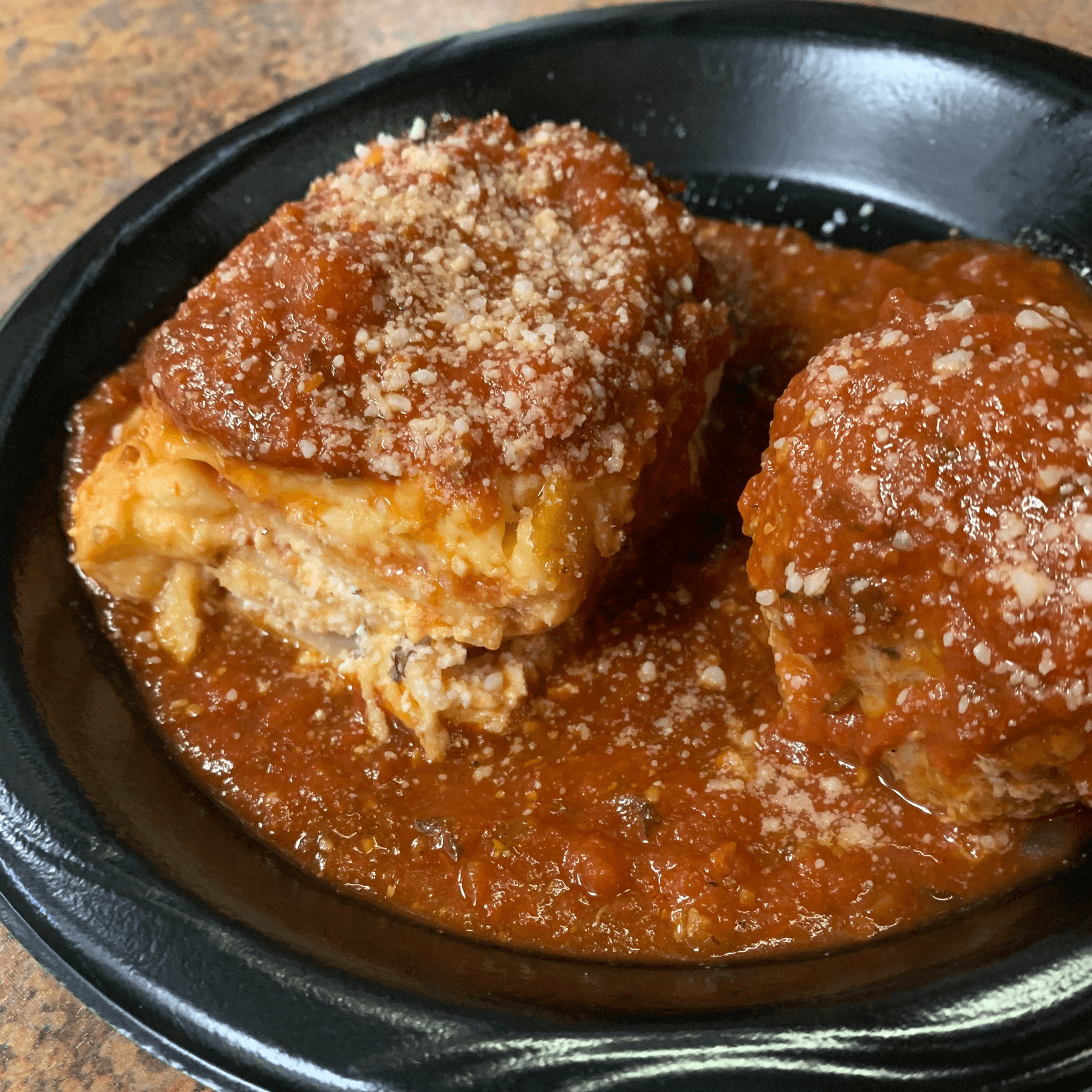 Homemade lasagna, made fresh on Fridays. Served with a homemade meatball and garlic bread.
