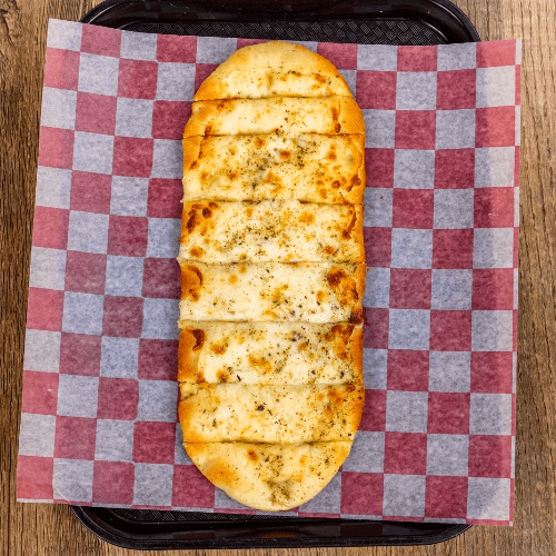 Our flatbread pizza crust with a glaze of garlic butter and topped with melty cheese.
